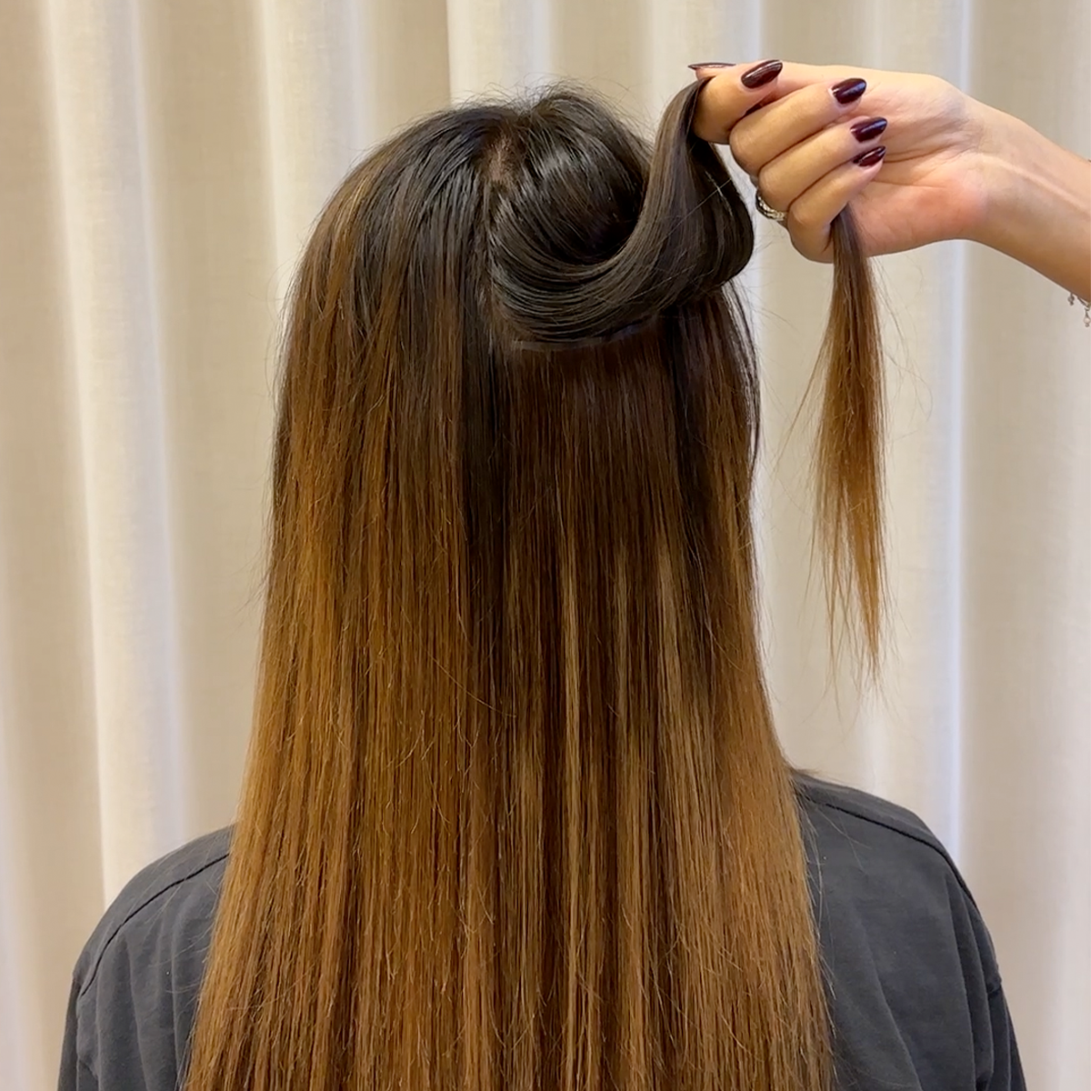 Wenn du eine oder mehrere Tape Wefts an den Seiten anbringst, ist es wichtig, dass der Scheitel leicht nach oben in Richtung deines Gesichts verläuft. Das sorgt für ein schönes, natürliches Ergebnis und erleichtert dir das Hochstecken deiner Haare.