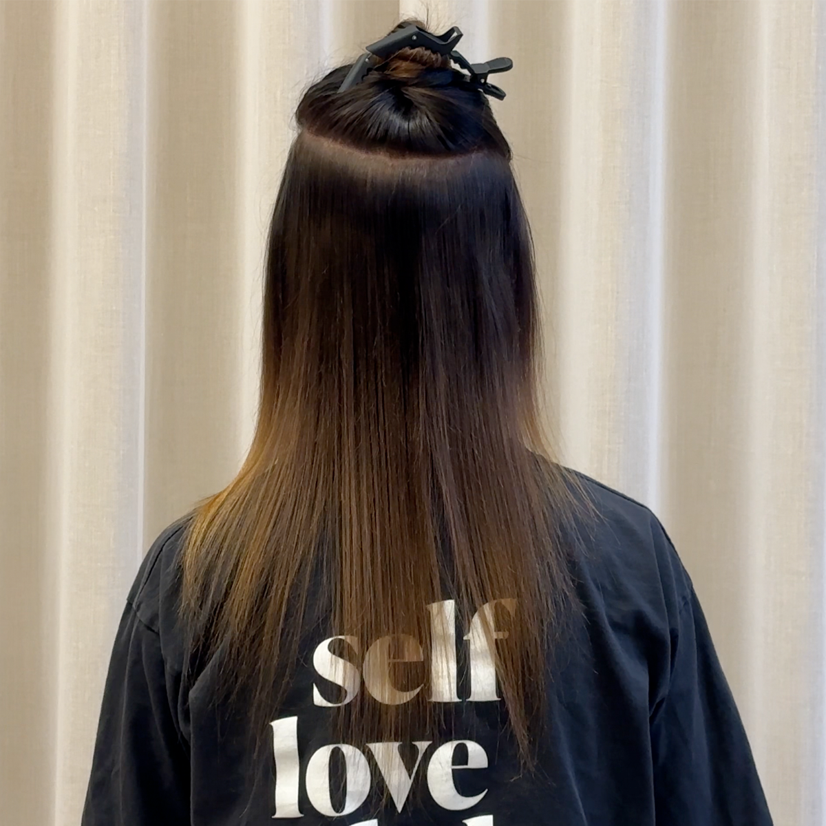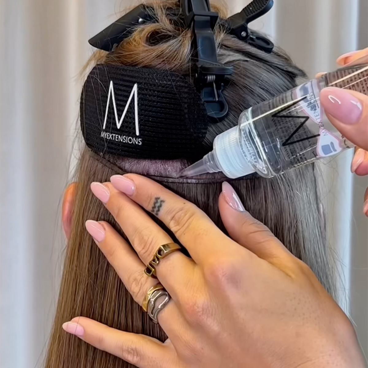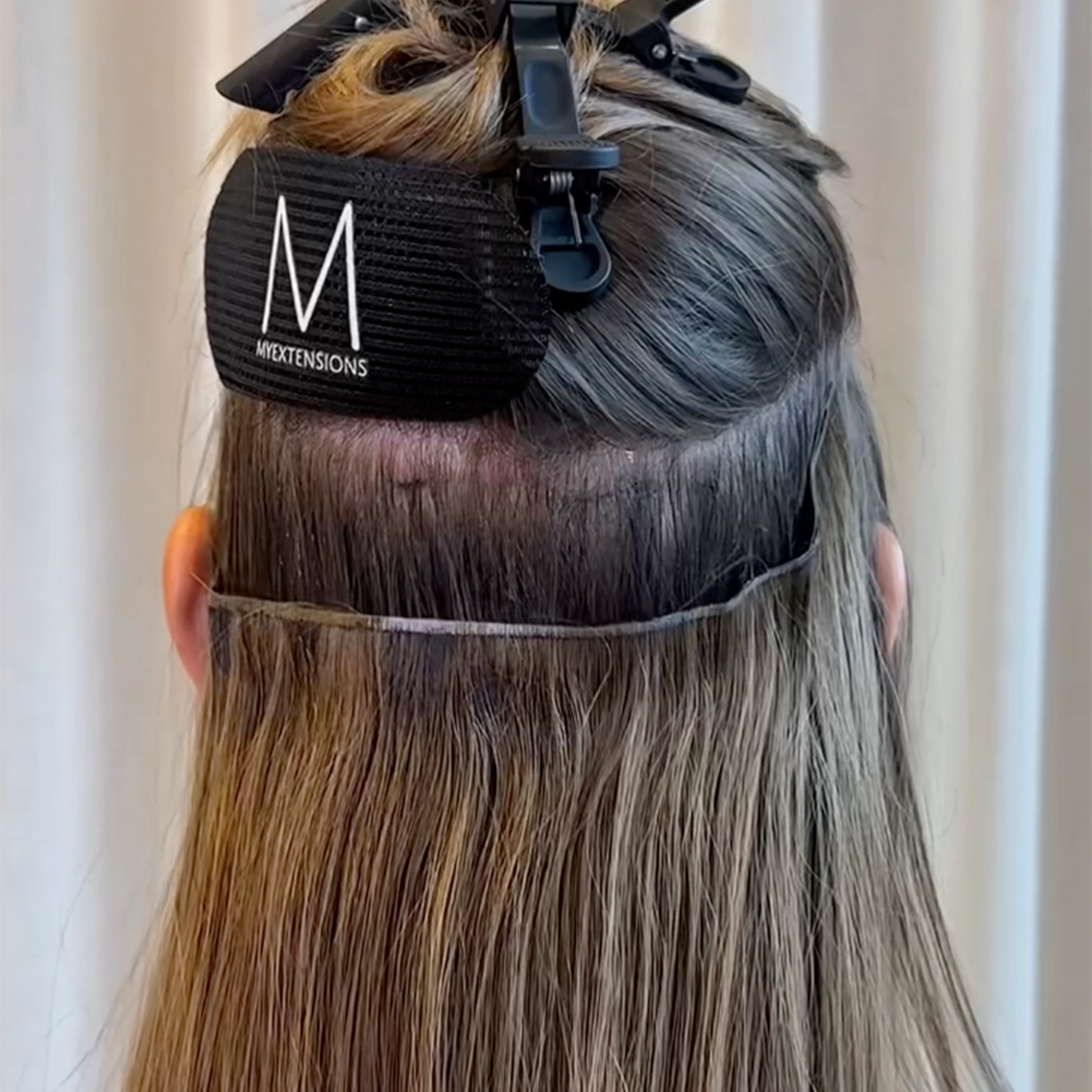 💡Wichtig: Berühre das Tape während des Anbringens nicht, da dies die Klebekraft beeinträchtigen und dazu führen kann, dass deine Extensions verrutschen.