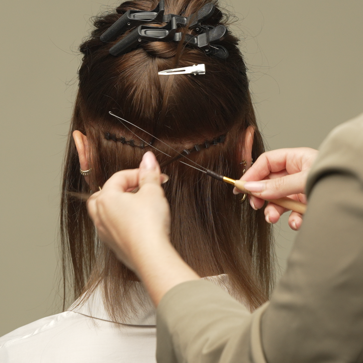 Beim Annähen deiner Tressen machst du einfache Stiche durch die Tressen und dein eigenes Haar, das zwischen den Mikroringen befestigt ist. Du solltest also im Haar zwischen den Mikroringen nähen und nicht in den Mikroringen selbst.