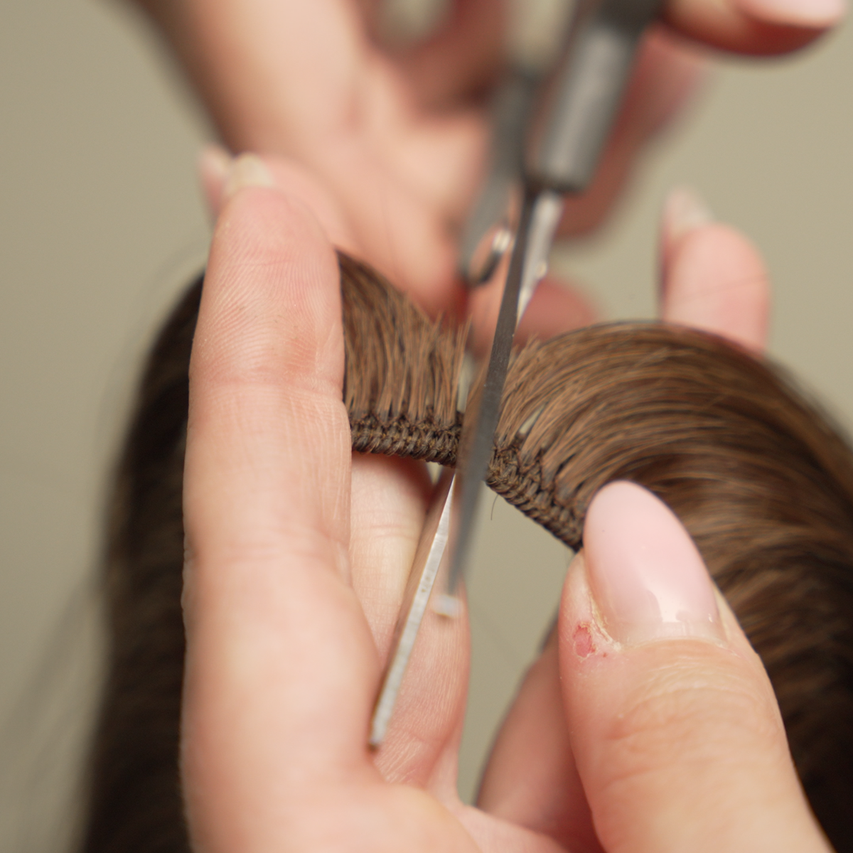 - Beginne damit, den Nähfaden zu durchtrennen – benutze eine kleine Schere und sei beim Schneiden vorsichtig, damit du weder dein eigenes Haar noch deine Extensions schneidest.