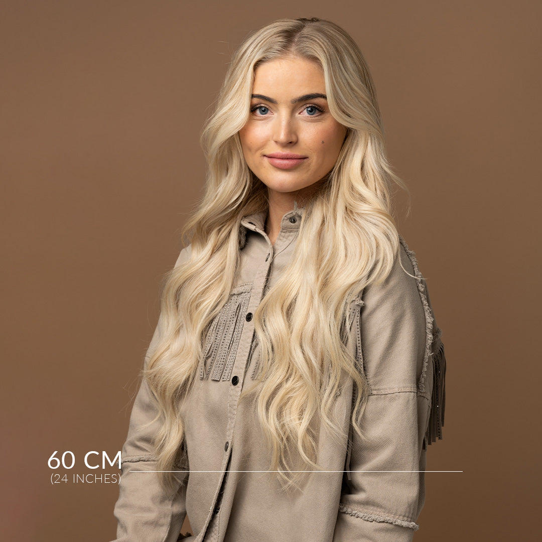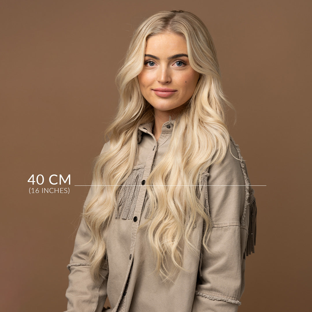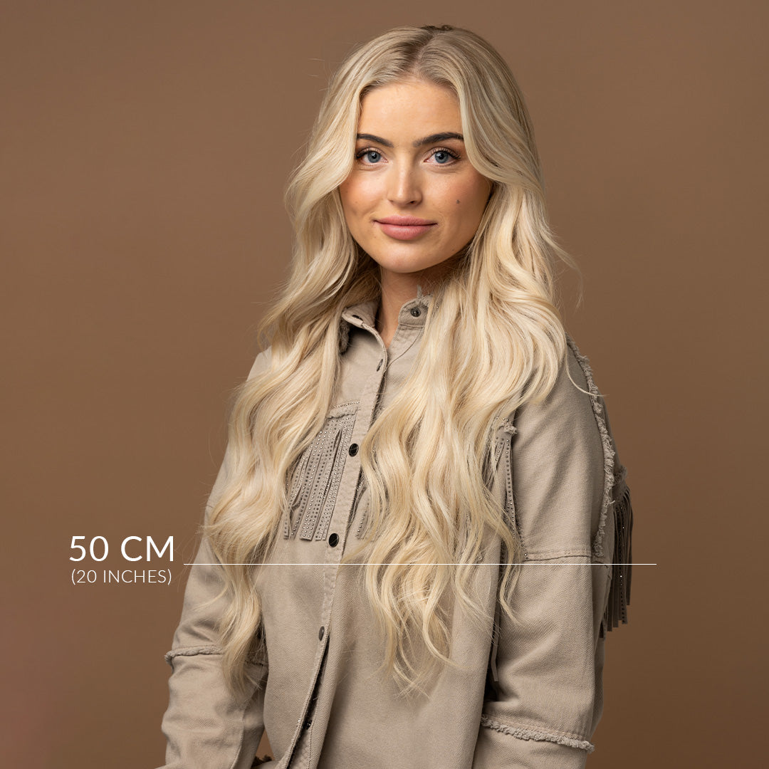 50 cm sind für die meisten Menschen genau richtig – und wenn dir das dennoch zu lang ist, kannst du deine Extensions jederzeit ein bisschen schneiden lassen. So erhältst du auch ein natürlicheres Ergebnis.